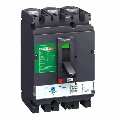 EasyPact CVS100B is a 3 poles 3d fixed circuit breaker with a high level of performance and cost-saving functionality. It is an optimal choice for small and medium-sized buildings protection applications. The breaking capacity (Icu) is 25kA rms at 415VAC 50/60Hz. The operational voltage is 440VAC 50/60Hz. This product embeds a 25A rating thermal-magnetic trip unit (TMD). TMD trip unit provides an adjustable thermal overload protection and a fixed magnetic protection. This 3 poles version (105mm x 161mm x 86mm) comes with a variety of optional functions and accessories. EasyPact CVS100B is compliant with international standards (IEC 60947, CCC, EAC). It can be installed in class II insulation switchboards as it is a class II front face device (IEC 60664-1).