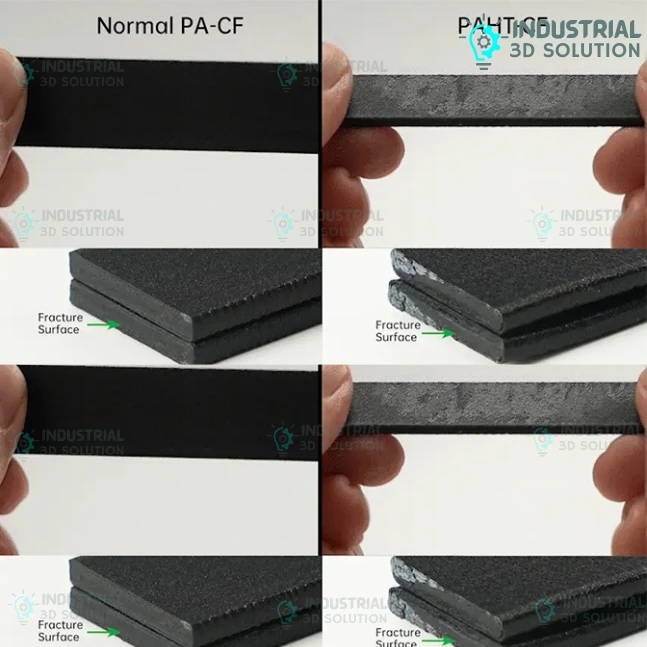 Bambu PAHT-CF offers significantly stronger interlayer bonding compared to normal PA-CF, improving impact resistance and reducing the risk of delamination.