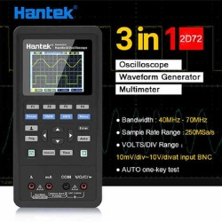 The Hantek 2D72 is a powerful and versatile 3-in-1 handheld device that combines a digital storage oscilloscope (DSO), a high-precision multimeter, and a signal generator into a compact and portable unit. Designed for electronics engineers, technicians, students, and hobbyists, this device offers a 70MHz bandwidth, 250MSa/s real-time sampling rate, and dual-channel input, making it an ideal solution for diagnosing and analyzing electronic circuits, testing signals, and measuring electrical parameters.