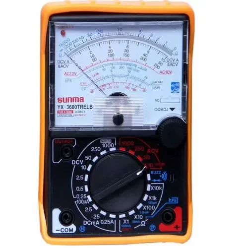 Special Functions: Diode Test Transistor Test Continuity Buzzer About 100 Ω Function Protection Iso: 150µA - 15mA - 150mA Product Specification Model No.YX-360TRE-BType Product Analog Multimeter AC Voltage (Volts) 10-1000 VAC Voltage Accuracy ± 4% DC Voltage (Volts) 0.1m.V-10000VDC Voltage Accuracy ± 3% DC Current (Amp) 50μA-10 ADC Current Accuracy ± 3% Resistance (Ohm) 0.2Ω-20MΩ Resistance Accuracy ± 3% hFE(TR Amplification Factor) 0-1000Size(mm) 148x100x35mm Includes Test Leads, Holster, Manual. >> analog multimeter with mirror scale inbuilt buzzer and led 0 Ω adjustment with x 100 range transistor test, hfe with diode >>>measure up to 1000 using optional tr connectoSeries capacitor terminal (output) block dc >>fuse and diode protection, package contents: 1 analog multimeter.