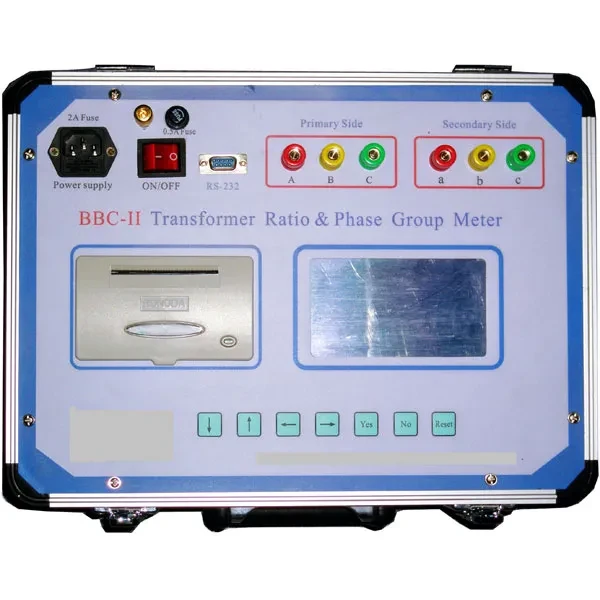 Automatic Transformer Ratio & Phase group meter, BBC-II is based on microprocessor, designed to measure the ratio of single-phase transformer, tri-phase transformer, tri-phase transformer with on-load tap-changer or off-line tap-changer, potential transformer, and so on. It automatically measure windings polarity and phase group. BBC-II can detect and measure ratio of any transformer type, also including interconnected star connection. BBC-II generates its own 3-phase transformer test output voltage from the single-phase AC power input. 3-phase test voltages allow to test single phase and tri-phase potential transformer, distribution transformer, and power transformer, while the magnetic circuit is same as it works, thus the measure results are precise.