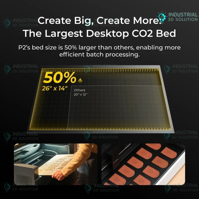 The xTool P2S 55W Desktop CO2 Laser Cutter is a high-precision, compact laser engraving and cutting machine designed for professional and hobbyist users in Bangladesh. Equipped with a 55W CO2 laser and dual 16MP HD cameras, it delivers sharper previews, finer precision, and superior cutting speed on wood, acrylic, fabric, leather, and over 300 compatible materials. The AutoPassthrough™ feature enables processing of materials up to 118 inches long, while 3D Curve™ engraving allows seamless marking on curved surfaces. With a 23.6" × 12" workbed, this desktop CO2 laser cutter is ideal for makers, engineers, signage workshops, and educational labs in Dhaka and across Bangladesh. Compatible with xTool Studio, Lightburn, and other leading software, it provides reliable, efficient, and professional-grade laser cutting and engraving in a user-friendly package.