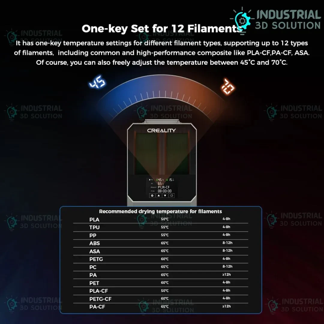 Compatible Filaments: PLA, ABS, PETG, Nylon, Carbon Fiber composites, other moisture-sensitive filaments
