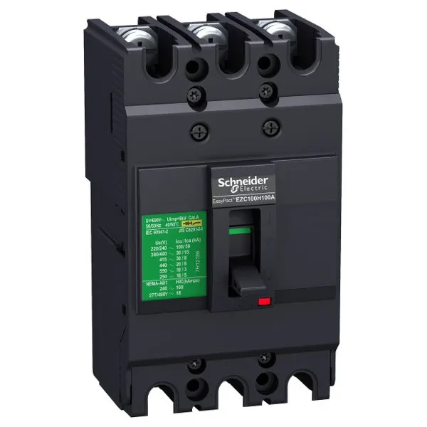 EasyPact EZC100N is a 3 poles fixed circuit breaker designed for the protection of low voltage electrical installations. It is used for standard applications in industries and buildings, offering good performance at competitive price The breaking capacity (Icu) is 15kA rms at 415VAC 50/60Hz. The operational voltage is 550VAC 50/60Hz or 250VDC. The rating of the thermal-magnetic trip unit is 25A. The trip unit provides fixed overload and instantaneous protections. This 3 poles version (75mm x 130mm x 60mm) comes with a variety of optional functions and accessories. Easypact EZC100N is compliant with international standards (IEC 60947, UL 508) and marine certifications.