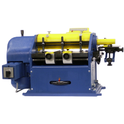 The ICM-2a Double Creasing Machine is expertly crafted to produce slot liners and closures from a variety of insulation materials, including Elephantide, Presspan, and Mylar. It features simple, quick adjustment settings, and ensures precise spacing between creases. The creasing pressure is easily adaptable to the thickness and density of materials, adjusted via a calibrated thumbwheel. An automatic centering mechanism positions the insulation strip using a threaded screw with handwheel adjustments, and the distance between creases is displayed on the machine’s scale.