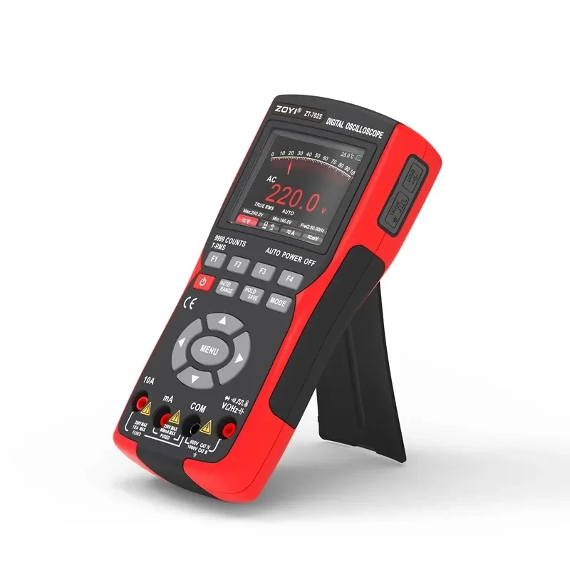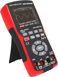 Double Injection Model, Color LED screen Safety: Independent battery storage compartment, supports charging and measuring while working Humanized: Screen brightness and the standby time can be adjusted Convenient: Portable, one-hand operation(button design) In the box: Oscilloscope Zippered carrying case One pair of DMM test probes One oscilloscope probe One temperature probe User manual Highlights: Counts 9999 Transmission bandwidth 10M Sampling method real-time sampling Channels Single channel probe input measurement sampling rate 48MS/s Storage depth 64Kpts display screen 2.8 inch IPS color screen DC Current 10A AC Current 10A DC Voltage 1000V AC Voltage 750V Resistance 100MΩ Capacitance 100mF frequency 1MHz Temperature (-20~1000)°C CE Specifications: Display:2.8 inch IPS full viewing angle color screen Ranging:Auto/Manual Material:ABS+TPE Update Rate:3 Times/Second Ture RMS:yes Data Hold:yes Backlight:yes Low Battery Indication:yes Auto Power Off:yes Dimension:177*89*40mm Weight::345g(NO BATTERY) Battery Type:18650 Battery * 1 Oscilloscope Specifications: Bandwidth:10MHZ Sampling method:real-time sampling real-time sample rate:48MSa/s Channels:1 input coupling:AC/DC input resistance:1MΩ,@16pf Probe attenuation:X1, X10 Max input voltage:150V (DC+AC peak) Sample rate range:1.5Sa/s – 48MSa/s Waveform interpolation:(sinx)x Sweep speed range:50ns/div – 20s/div Time Base Accuracy:20ppm record length:Max 64Kbyte sensitivity:20mV/div – 10V/div Displacement range:4 cells (positive and negative) Analog Bandwidth:10MHZ low frequency response:>10HZ Rise Time:<10ns DC Gain Accuracy:±3% Multimeter Specifications: DC Voltage (V):999.9mV/9.999V/99.99V/999.9V DC Voltage (mV):9.999mV/99.99mV AC Voltage (V):999.9mV/9.999V/99.99V/999.9V AC Voltage (mV):9.999mV/99.99mV *Frequency response of ACV: 40Hz-1kHz DC Current (A/mA):9.999A/999.9mA DC Current (μA/mA):99.99mA/9999μA AC Current (A):9.999A/999.9mA AC Current (μA/mA):99.99mA/9999μA Frequency response of AC Current: 40Hz-1kHz Resistance:99.99Ω/999.9Ω/9.999kΩ/99.99kΩ/999.9kΩ/9.999MΩ/99.99MΩ Capacitance: 9.999nF/ 99.99nF/999.9nF/9.999μF/99.99μF/999.9μF/9.999mF/99.99mF Frequency: 99.99Hz/999.9Hz/9.999kHz/99.99kHz/ 999.9kHz Temperature:(-20~1000)°C/(-4~1832)°F Diode :yes Continuity:yesTWO IN ONE - Oscilloscope + DMM Built-in lithium battery + Type C charging cable single channel, 2.8-inch IPS full-view color screen, 10 MHZ Bandwidth, 48MSa/s real-time sampling rate, 9999 counts, for school education, automobile maintenance, power detection, and delicate repairs.