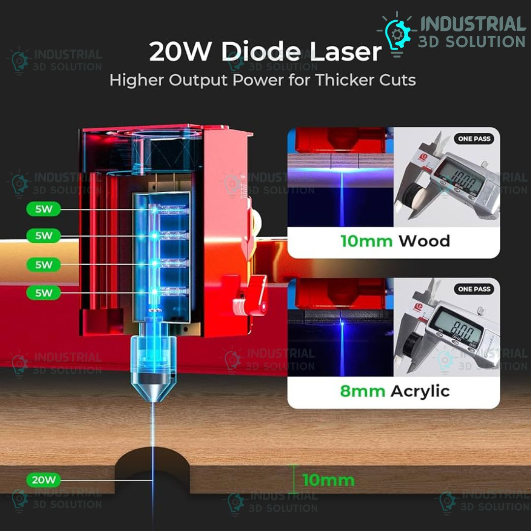 Built with a robust mechanical structure, advanced safety features, and intelligent motion control, the D1 Pro 20W offers 0.01 mm motion accuracy and engraving speeds of up to 400 mm/s. Its large working area, expandable height system, and wide accessory support make it a powerful and future-ready laser solution.