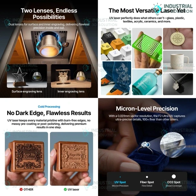 • Multi-Material Compatibility – Engraves glass, acrylic, plastic, coated metal, ceramics, and electronics components