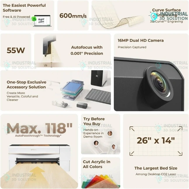 The xTool P2S 55W Desktop CO2 Laser Cutter – P2S All-in-One Bundle is a professional desktop laser cutting and engraving solution designed for makers, workshops, small manufacturing units, and signage businesses in Bangladesh. Powered by a high-precision 55W CO2 laser and equipped with dual 16MP cameras and LiDAR autofocus technology, the P2S delivers unmatched accuracy in laser cutting and engraving across wood, acrylic, leather, fabric, bamboo, metal-coated surfaces, and more. Its large 600 × 305 mm working area allows efficient batch production while maintaining consistent results. Fully compatible with xTool Studio, xTool Creative Space, and LightBurn, the machine supports over 300 materials and enables advanced operations, making it ideal for professional prototyping, industrial fabrication, educational labs, and creative workshops in Bangladesh.